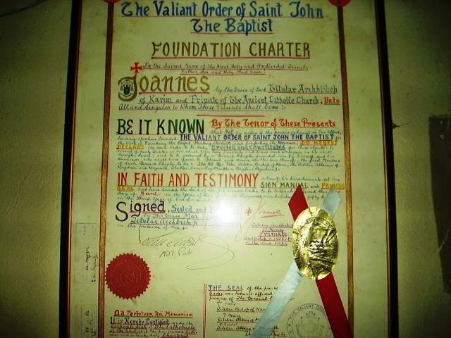 Be it Known by the Tenor of These Presents that WE by virtue of the powers inherent in Our Office, having aforetime Founded THE VALIANT ORDER OF SAINT JOHN THE BAPTIST for the work of Preaching the Gospel, Healing the Sick and Comforting the Mourner, DO HEREBY DECLARE the said Order to be duly Erected and Constituted for those objects: to consist of such Fraters as We shall over time prescribe and to wear such Insignia as We shall hereafter desire, and to be governed by a General Chapter presided over by Ourself and Our Successors, who shall have power to approval and honour all Members thereof, the first Members of such General Chapter to be: The Rt. Rev. Peter, Titular Bishop of Naim, The Titular Abbesses of Magdala and Nazareth, The Rev. Canon Roy Mowbray Douglas (Registrar).