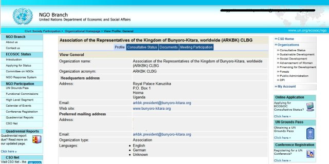 ARKBK CLBG now registered as an NGO with the United Nations On May 23, 2012 By johnkerseyIn News The Association of Representatives of the Kingdom of Bunyoro-Kitara worldwide (ARKBK CLBG) has been accepted and registered as an NGO in the United Nations’ Department for Economic and Social Affairs (DESA) Civil Society Database. Related