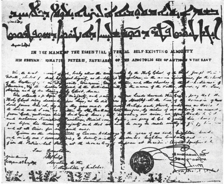 “In the Name of the Essential, eternal, Self-existing, Almighty God. A.F.X. Alvarez Julius I Paul Mar Athanasius, and George Mar Gregorius, Metropolitans under Antioch.