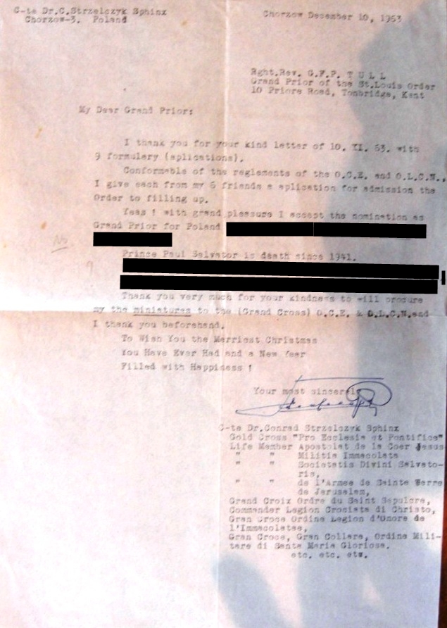 General Strzelczyk was appointed Commandeur of the Order of the Crown of Thorns on 1 November 1934 and promoted to Grand Cross on 15 August 1956. He received the Grand Cross of the Order of the Lion and the Black Cross on 2 February 1936. He was appointed Chanoine d’Honneur de l’Ancienne Abbaye de San Luigi on 4 March 1936. He also received the rare honour of a title of nobility conferred by the Abbey-Principality, when Prince-Abbot Edmond II conferred upon him the title Duke of the Crown of Thorns. From 1963 he served as Grand Prior of the San Luigi Orders for Poland.