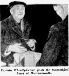 A newspaper report of 1951 details Wheatly-Crowe’s custody of the mummified heart of the Marquess of Montrose, which had been gifted to him in 1931 and had successively reposed in a glass case in his Hampstead home and under the bed in his New Forest residence. The Marquess had been executed in 1650 as a result of his failed attempt at a rebellion in favour of the restoration of Charles II. The reporter recalls that Wheatly-Crowe brought the relic down while he was having tea with him, and placed the “brownish-black, leathery lump” on the table. Wheatly-Crowe eventually sent the heart by registered air mail to a descendant of Lord Napier, a prior recipient, in Canada.