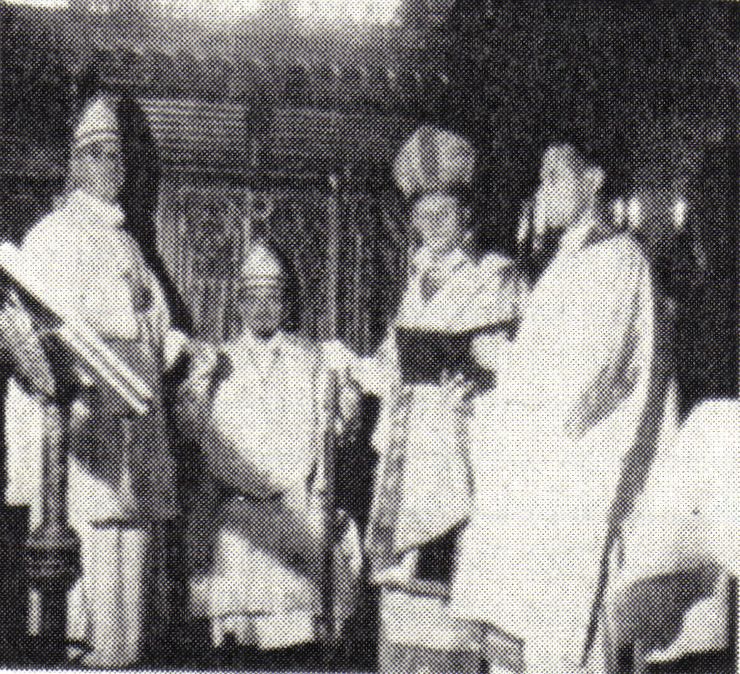 On 6 November 1949, at the mansion chapel of the Lord Patriarch Banks in East Molesey, van Ryswyck received conditional ordination up to the priesthood from Mar Georgius of Glastonbury (q.v.), who was a senior member of the San Luigi Orders. On 20 November, at Eldon Lodge, van Ryswyck was conditionally consecrated by Mar Georgius in an elaborate ceremony. This was described in Christocracy, the journal of the Apostolic Church of St Peter, as follows, “After the opening voluntary, Ave Verum, the procession entered to the music of the Creed, rendered by the choir of the Russian Orthodox Church of Paris. The Lord Patriarch [Mar Georgius] was attired in robes of cloth of gold. Bishop Langhelt and Fr. Sandys-Pemberton in white dalmatic and tunicle respectively, and Mgr. van Ryswyck in white and gold, in sharp contrast to which stood out the black and white bands of the Solicitor (Mr E.F. Power-Green). It is interesting to note that the epigonation worn by Mgr. van Ryswyck was presented to him by Bey Sulik Acarli, President of the Turkish Social Democratic Party, and Sacretary of the Red Crescent…After the long function Mgr. van Ryswyck was solemnly enthroned by the Patriarch by the name, style and jurisdiction of Mar Joannes, Lord Bishop of Ryswyck, and Imperator of the Ordo Equestris Militaris Avatar…Before the recessional, His Beatitude conferred upon Brigadier L.M. Poole, D.S.O., the Knighthood of the Order of St Gregory and Sarkis, and upon the Bishop of Ryswyck, the grade of Knight Grand Cross with the title of Duke de Richelieu-Ryswyck in the Order of the Spiritual Christian Nation [a body founded by the late Patriarch Frederic C.A. Harrington of the Ecclesiae Rosicrucianae Catholicae], these honours having been awarded for the services which the gentlemen concerned had rendered to religion.” The photograph taken after the ceremony above shows van Ryswyck seated, with, from left, Mar Francis (Langhelt), Mar Georgius and Fr. Sandys-Pemberton.