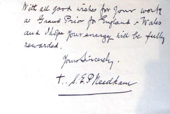 Needham’s early career was in the Army. He was gazetted Second Lieutenant in the 1st Volunteer Battalion, the Warwickshire Regiment in July 1902, transferring to the 5th Battalion as Lieutenant in 1908. He then served with his regiment in the First World War as a Captain, ending the war as second in command of the 5th Battalion. Having trained for the Anglican ministry, he was appointed Rector of Farthinghoe in Northamptonshire in 1925, also becoming responsible for nearby Thenford in 1931. He was married to Constance Evelyn, née Yates, who would predecease him in 1952.