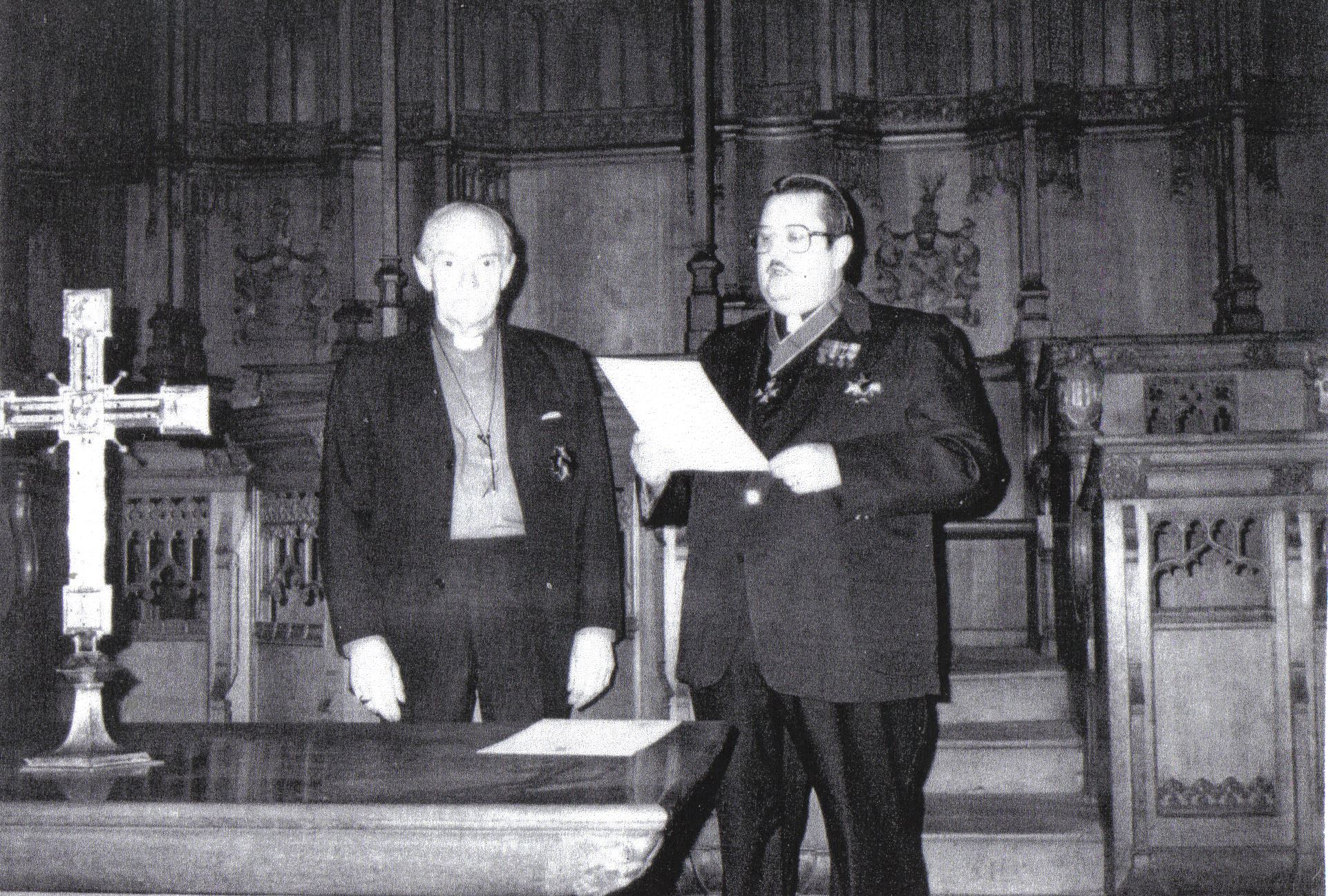 William James Mathias (1919-90) was also consecrated by Needham on 6 January 1953, albeit in conditions of some secrecy, since he was also a priest of the Church of England. Mathias was Vicar of St Marks, Victoria Park, at that time, and subsequently served the Anglican Church in posts in London, Australia and lastly as Vicar of Abertillery (1965-77). In 1986, in the chapel of Mansfield College, Oxford, he imparted conditional episcopal consecration to Prince Kermit Poling de Gniezno, later Royal Patron of San Luigi, and a photograph from that occasion is below.