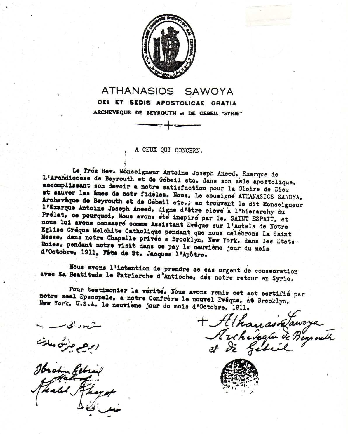 Aneed settled in New York, and began missionary work in Brooklyn where Melkite parishes had started to form. Soon after his arrival, Archbishop Sawoya visited the United States (against the wishes of the Pope) and stayed with Aneed for some time. On 9 October, Archbishop Sawoya consecrated Aneed as Assistant Bishop in his private chapel at Brooklyn (see certificate of consecration, right). While Patriarch Cyril IX Mogabgab, Melkite Patriarch 1925-47, later recognized this consecration, the Holy See did not.