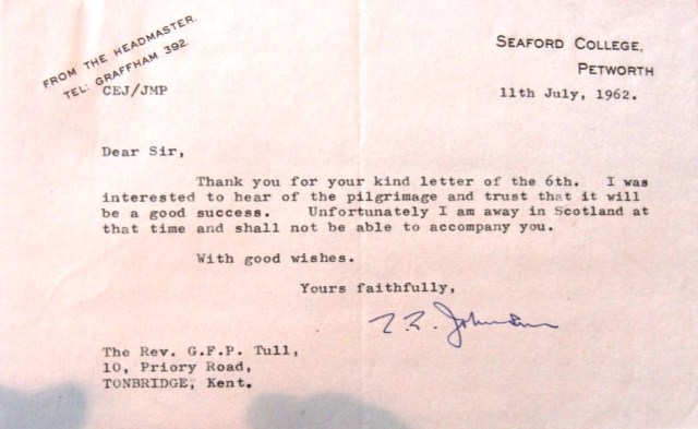 According to his obituary in the “Church Times”, Johnson attended Seaford College and then read History at Emmanuel College, Cambridge. He was captain of the University hockey team and continued to play the game for many years thereafter as a member of the Hounslow and Ealing Hockey Club. He trained for the ministry of the Church of England at Ridley Hall, Cambridge, and served his title at Woking. Whilst there, the governors of Seaford College invited him to be the school’s next headmaster, charged with re-establishing the school on a new site more suitable for expansion after the evacuation of the war years.