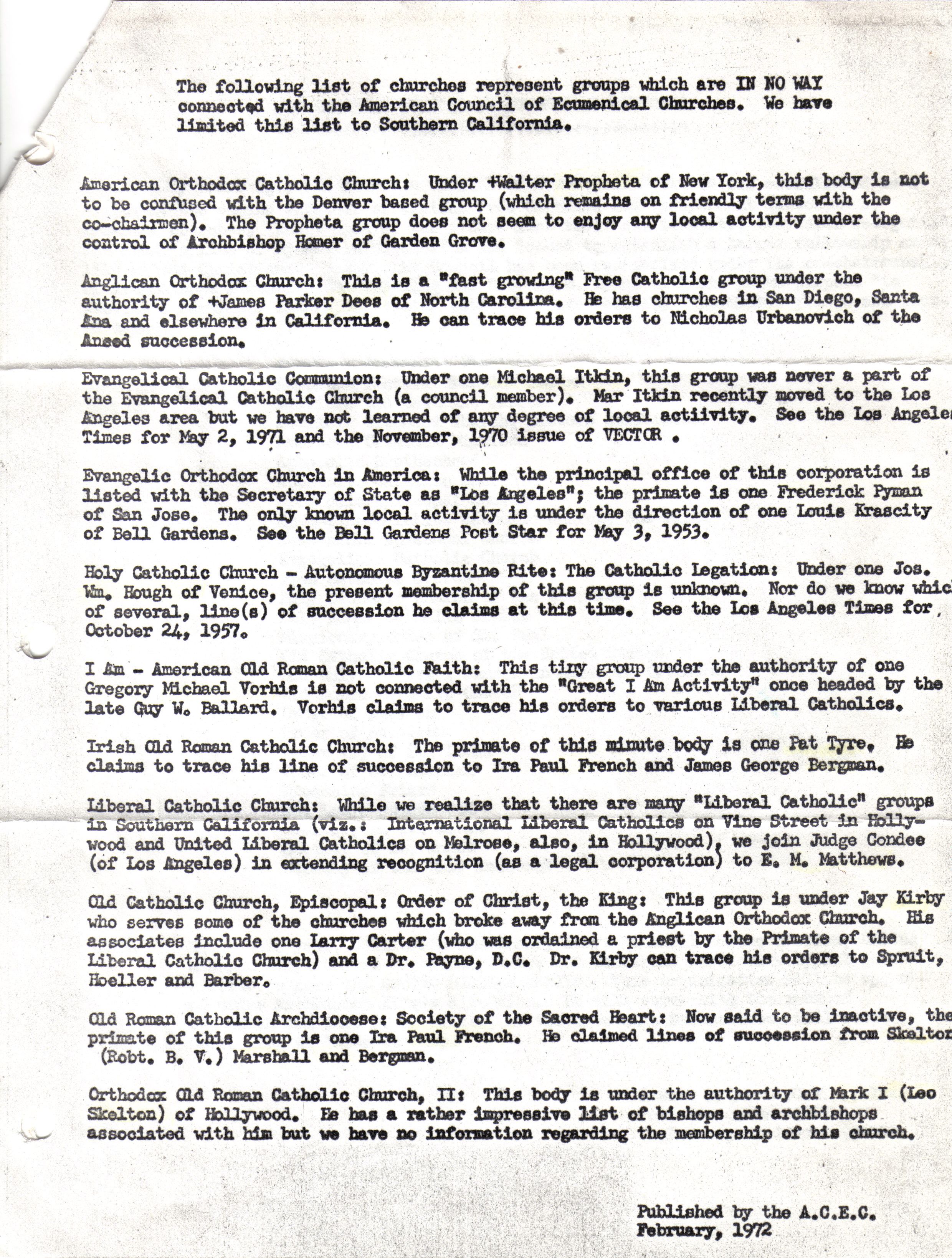 “A number of the Old Catholic groups have placed their tiny numbers under a San Luigi related organization of which I am president. Most of these churches were (and are) nothing more than paper organizations and there is nothing to do but go “up”. A listing will be published in a very short time and I will send you a copy of the same.”