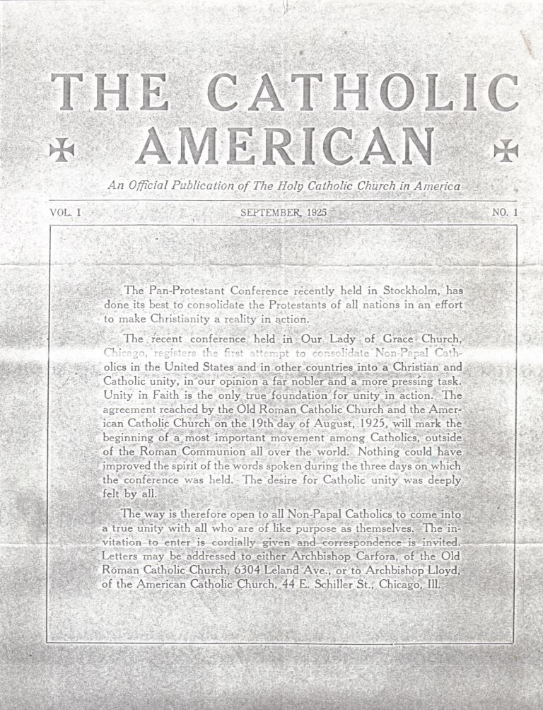 On 19 August 1925, following a conference at Our Lady of Grace Church, Chicago, Carfora’s church entered into formal union with the American Catholic Church under Archbishop Frederic E.J. Lloyd (who would go on to establish the Order of Antioch in 1928). This was as open acknowledgement by Carfora that he now considered the Holy Orders of the Vilatte line to be valid, as well as a recognition of his own episcopal origins. The agreement created the Holy Catholic Church of America as the unification of the two jurisdictions.