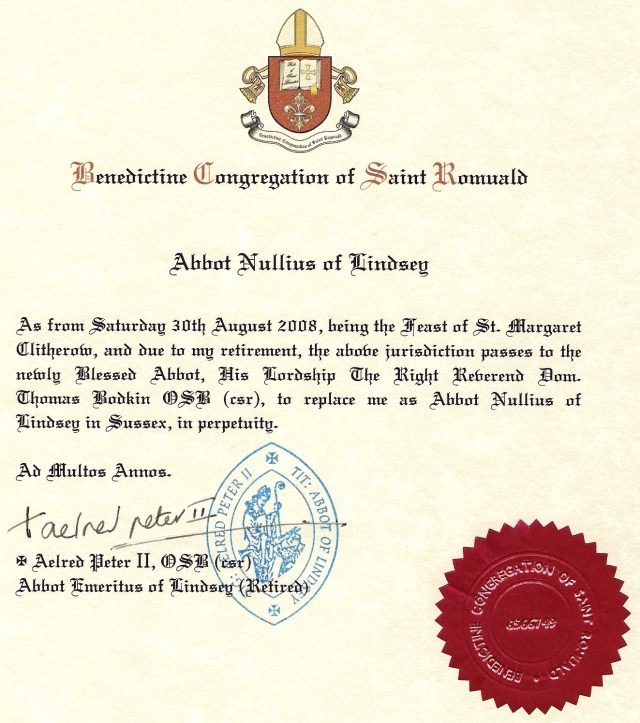 As of the dates mentioned above in 1995-96, Skelly had yet to enter into Solemn Profession in the Order, which he did not do until November 2001. Moreover, the evidence of the certificate above is that Skelly fully accepted the authority of Archbishop Distin on behalf of the Benedictine Order of St Romuald as of November 2001, and as is evident on the certificate of consecration, that Order was within the Titular Jurisdiction of Lindsey in Anglia – that is to say, subordinate to that jurisdiction. There is not a word of any appointment as co-adjutor or abbot on the certificate of consecration or indeed on any other document.