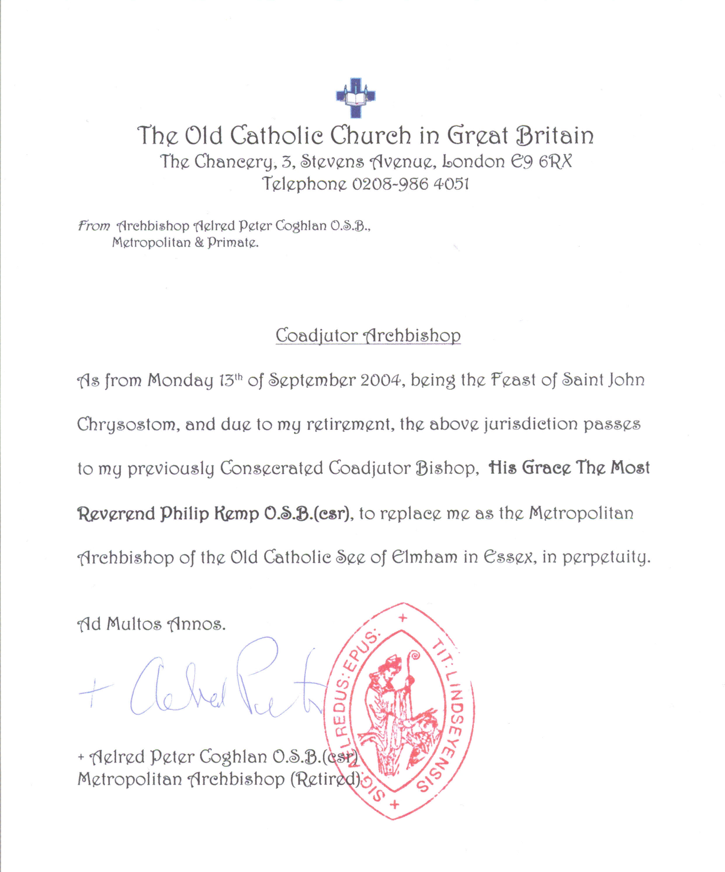 And here is the instrument of retirement of Archbishop Distin in favour of Archbishop Kemp, dated 13 September 2004, from which date Archbishop Kemp succeeded Archbishop Distin as Primate of the Old Catholic Church in Great Britain: