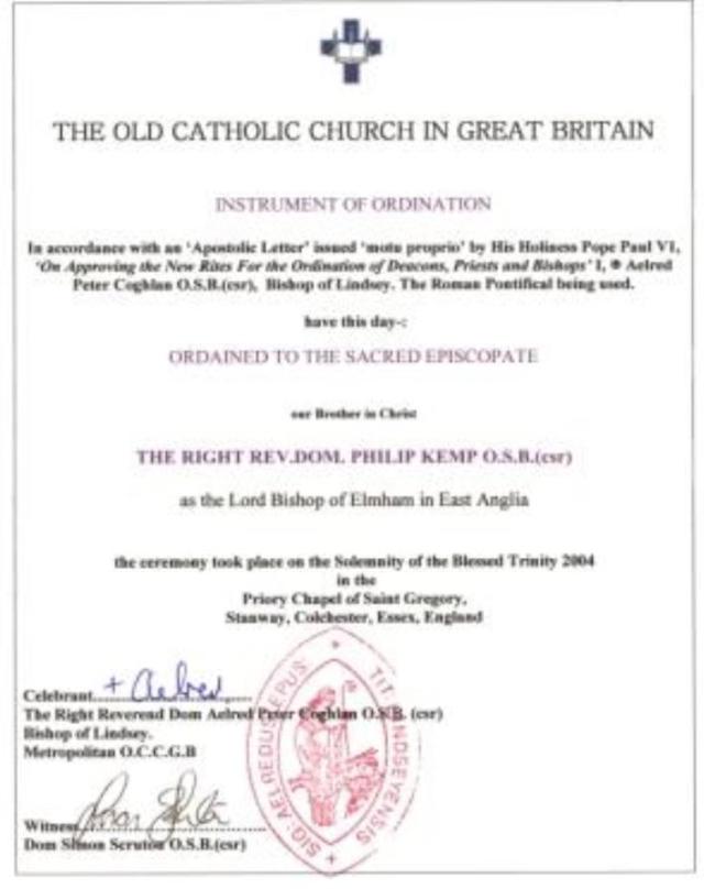 Here is Archbishop Kemp’s certificate of consecration by Archbishop Distin for the Old Catholic Church in Great Britain, dated 6 June 2004 and witnessed: