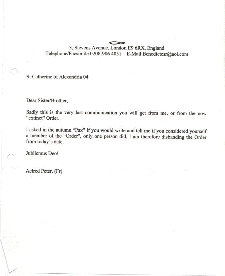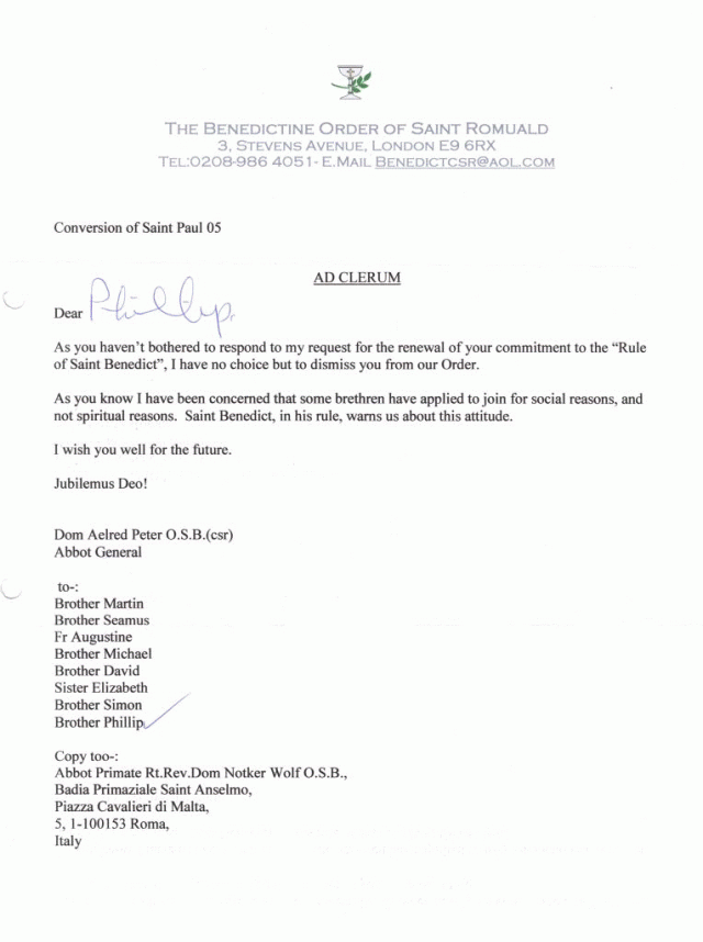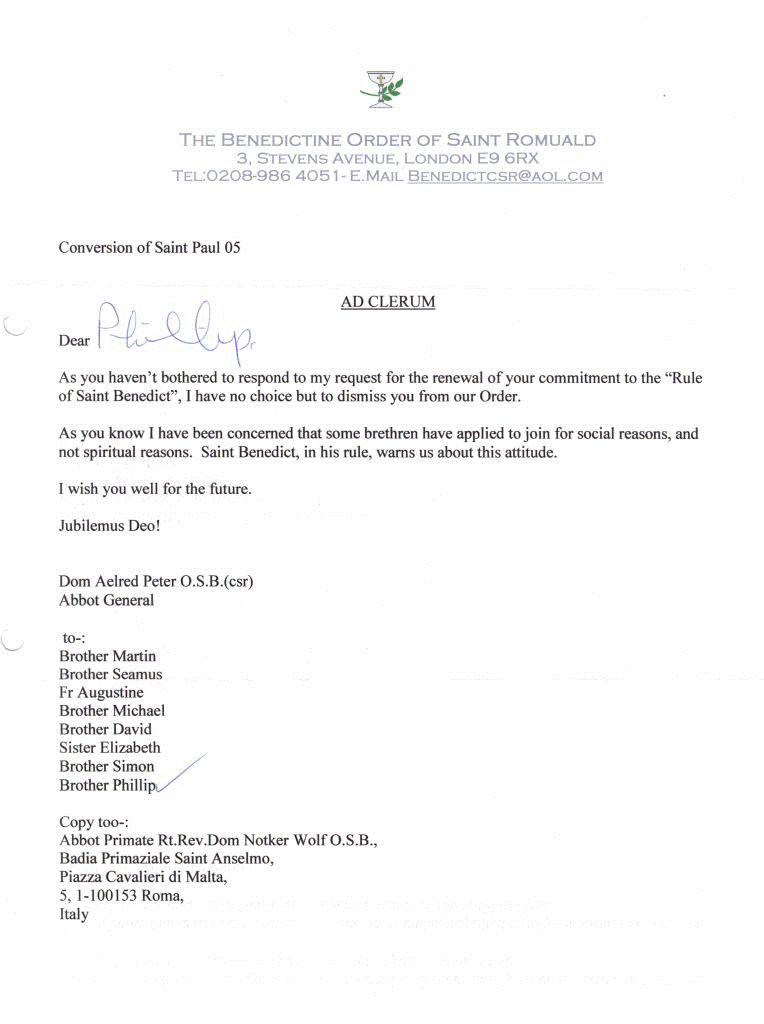 It appears that a “second chance” was then given, but that this produced no more encouraging a response. On 25 January 2005 Archbishop Distin dismissed all the members of the Order individually via an Ad Clerum, since they had failed to renew their commitment to the Rule of St Benedict as he had requested. “Brother Michael” is included on the list of members to be dismissed.