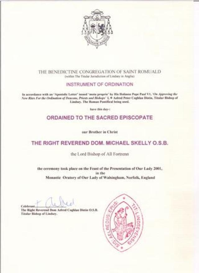 Let us begin with the position of Michael Skelly. In 2007, Skelly shared with me a copy of his Instrument of Solemn Profession in the Benedictine Congregation of St Romuald. The document is dated 21 November 2001 and witnessed by Archbishop Distin. This is accompanied by his Certificate of Episcopal Consecration by Archbishop Distin. The document is dated 21 November 2001 and it appoints Skelly as Lord Bishop of All Fortrenn in the Benedictine Congregation of St Romuald within the Titular Archbishopric of Lindsey in Anglia. These documents are reproduced below and are clear and unambiguous in their contents: