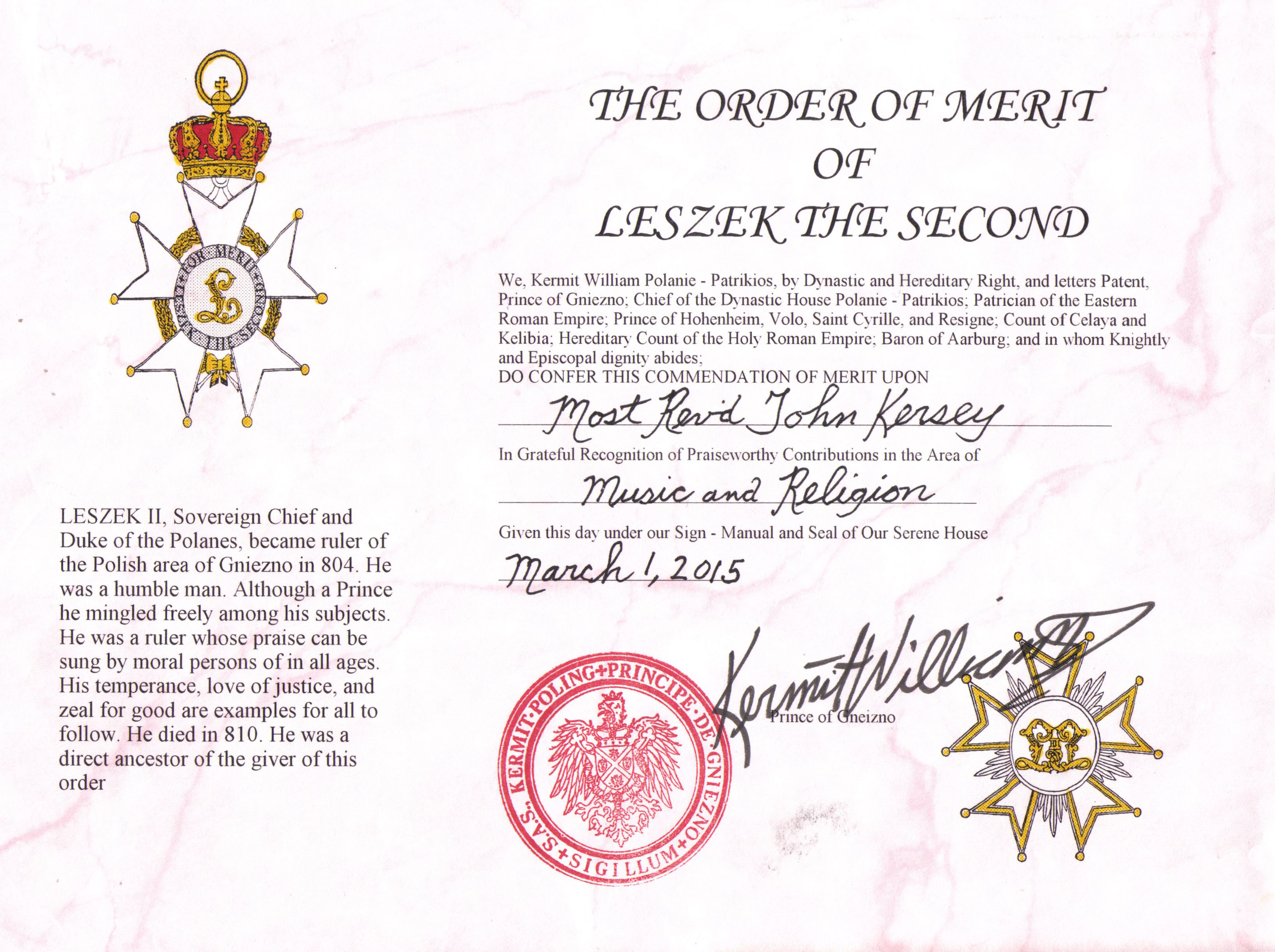 The Prince-Abbot has been honoured by our Royal Patron, Prince Kermit Poling de Gniezno, with the Order of Merit of Leszek II. This award was initiated by the Dynastic House Polanie-Patrikios as a reward for merit. Leszek II (Leszko II) was Duke of the Polanes between 804 and 810 and is an ancestor of Prince Kermit, who is 37th in descent from him. Leszek II is mentioned in the Chronica Polonorum by Wincenty Kadłubek (1190-1208).