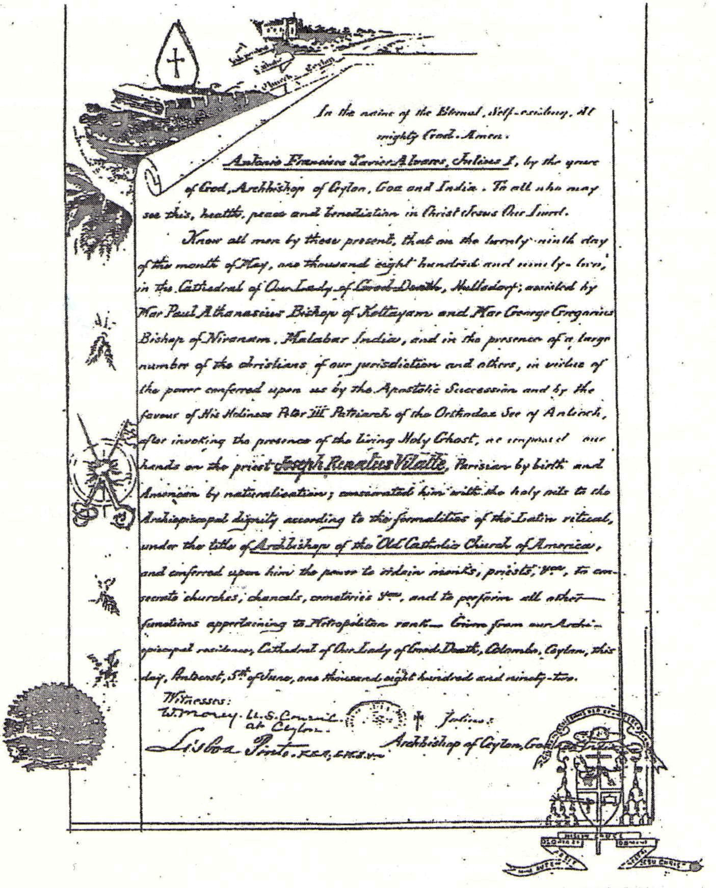 Dr Lisboa Pinto was present at the episcopal consecration of Metropolitan Mar Timotheus (Joseph René Vilatte, who would in 1899 become Prince-Abbot Joseph III of San Luigi) in 1892, and his signature is clearly visible on the Instrument of Consecration reproduced below.