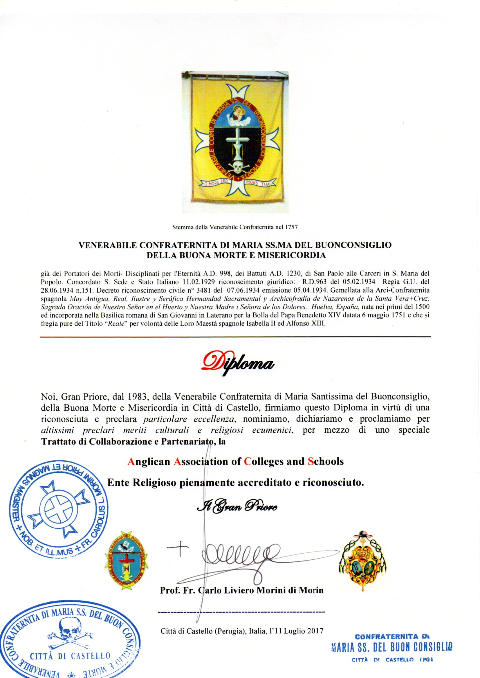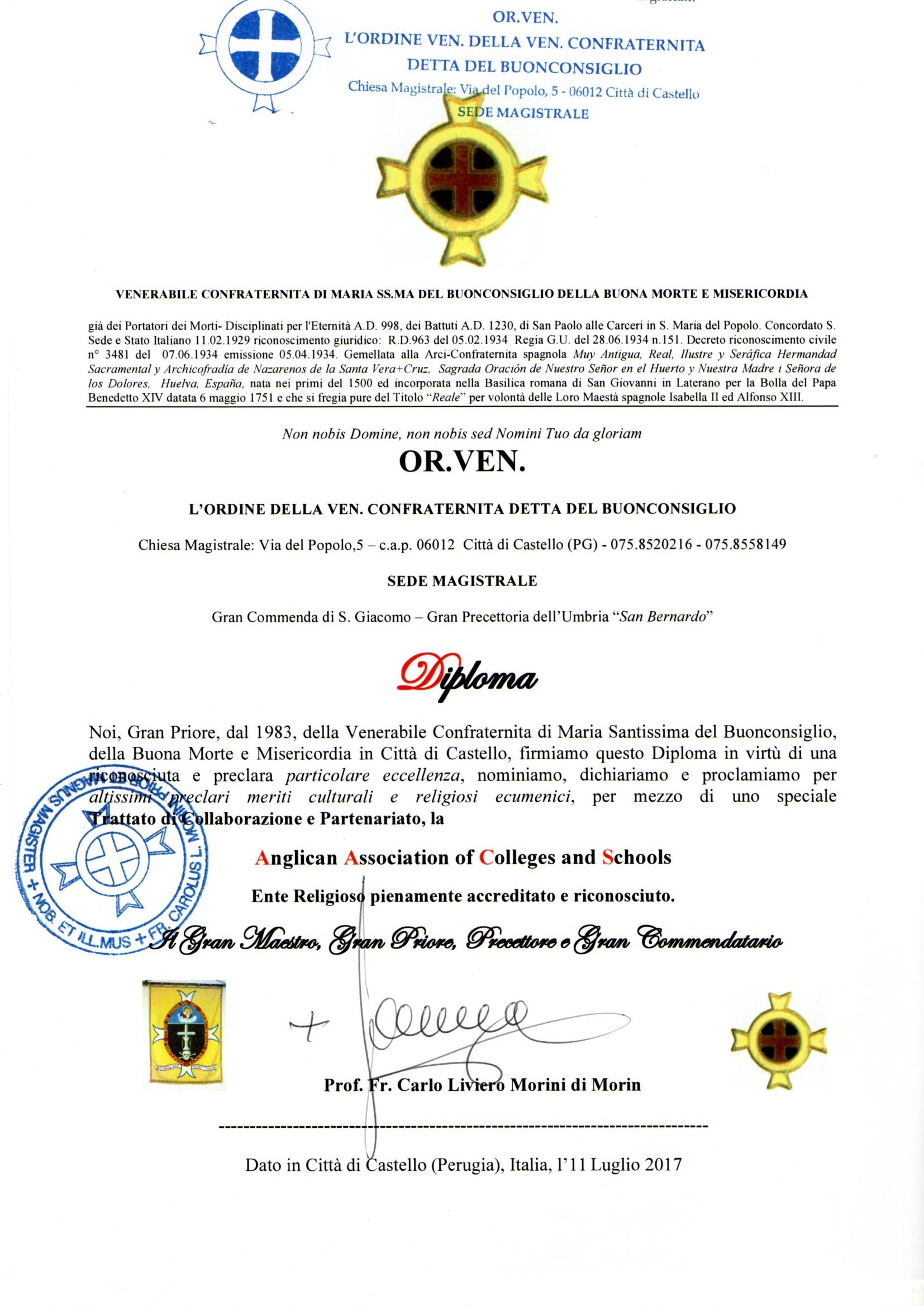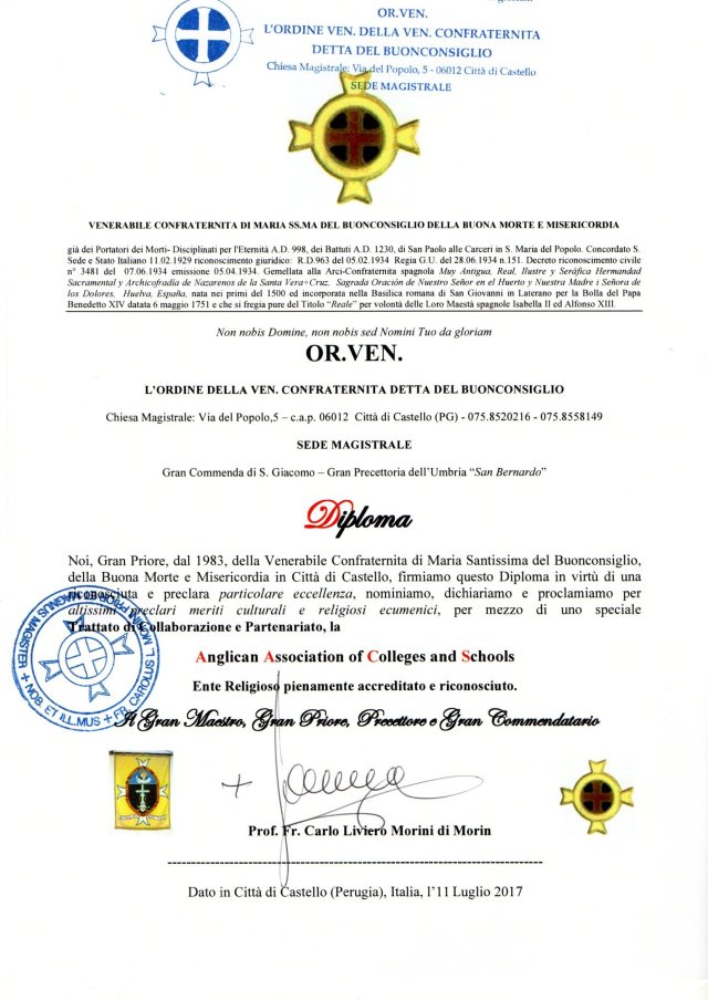 The Anglican Association of Colleges and Schools has entered into a Treaty of Full Collaboration, Partnership, Accreditation and Recognition with the Venerabile Confraternita (o Compagnia) detta del Buonconsiglio di Città di Castello and the OR.VEN. – Ordine Venerabile della Venerabile Confraternita di Maria Ss.ma del Buonconsiglio della Buona Morte e Misericordia, Città di Castello, Italy (Order of the Venerable Confraternity (or Company), known as of (Our Lady of) Good Counsel of Good Death and Mercy of Città di Castello). This chivalric and Christian brotherhood can trace its origins to the last years of the first millennium (990-999 A.D.) and in its present form dates to 1230, making it probably the oldest religious brotherhood in continuous existence today. The Order is based at Città di Castello (Province of Perugia) where it has its own Magistral Church, and is governed by a Grand Prior (Grand Master). The Primate of the Apostolic Episcopal Church has the honour to be a Perpetuum (Grand Cross) of the Order, its highest rank.
