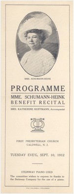 While living at North Caldwell, Schumann-Heink became interested in efforts to honor President Grover Cleveland by acquiring his birthplace and creating a museum in his honor. Friends, family and supporters of President Grover Cleveland asked her to perform at the First Presbyterian Church at Caldwell, New Jersey to raise money for the purchase of Cleveland’s Birthplace in the Presbyterian Manse. Cleveland’s father, Rev. Richard Cleveland had been the minister of the church when the future president was born in 1837. On September 10, 1912 Mme. Schumann-Heink performed a benefit concert at the First Presbyterian Church at Caldwell. The following year the Grover Cleveland Birthplace Memorial Association (GCBMA) purchased the Manse and opened it to the public and Mme. Schumann-Heink became the first lifetime member of the GCBMA.