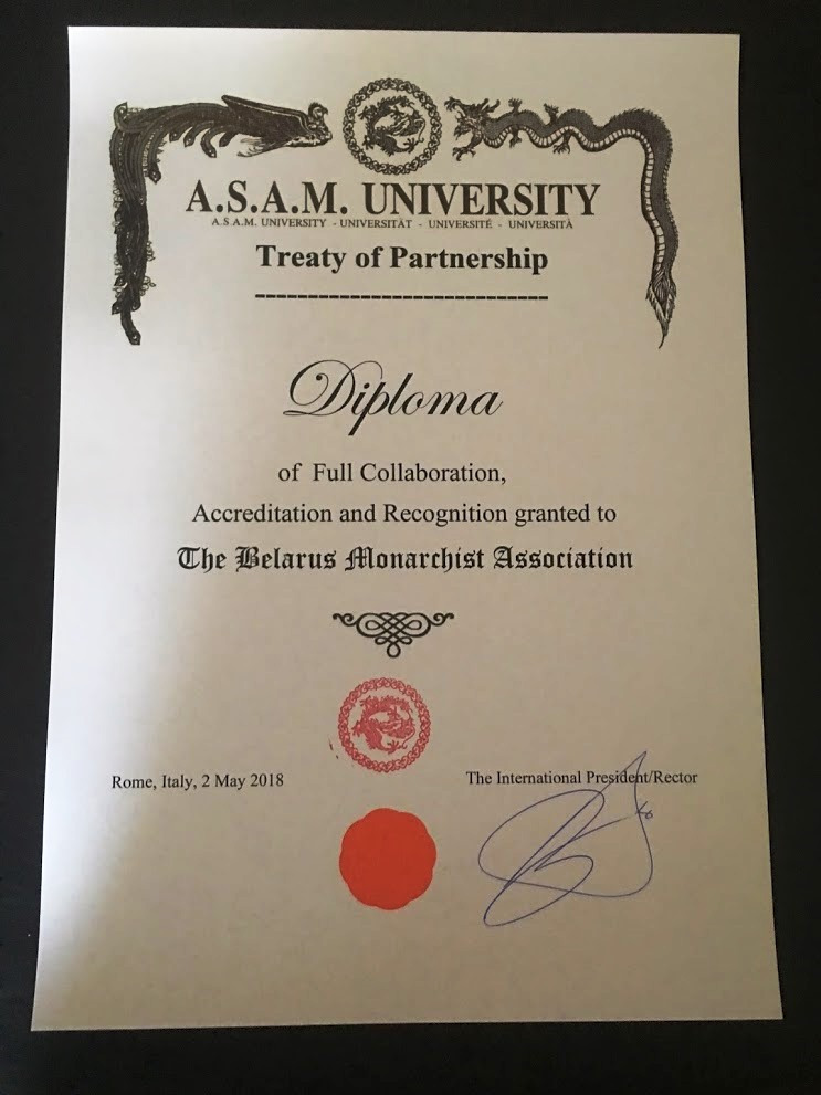 The Belarus Monarchist Association and the Constantinople Orthodox Institute have entered into mutual treaties of partnership, accreditation and recognition with the ASAM University. The ASAM University is a private university registered in Rome, Italy, since 1996. For further information, see this page.