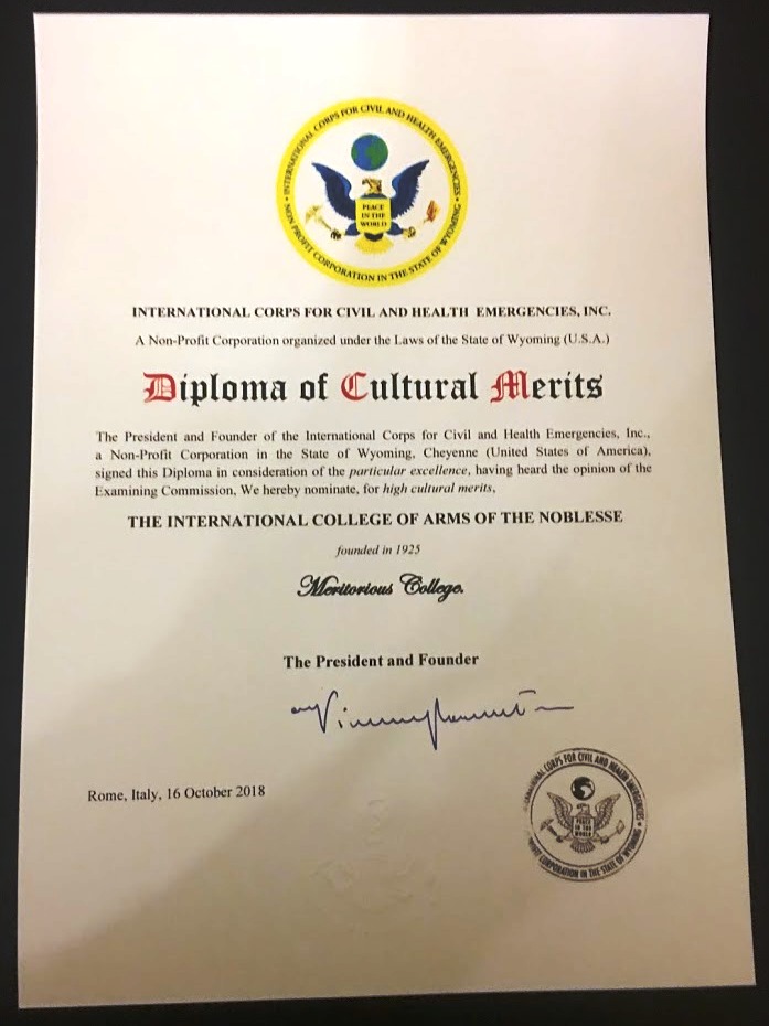 The International College of Arms of the Noblesse receives a Diploma of Cultural Merits from the International Corps for Civil and Health Emergencies, Inc. On October 16, 2018October 2, 2025 By johnkerseyIn News, San Luigi Gazette The International Corps for Civil and Health Emergencies, Inc., is established as a nonprofit corporation in the state of Wyoming, USA. Related
