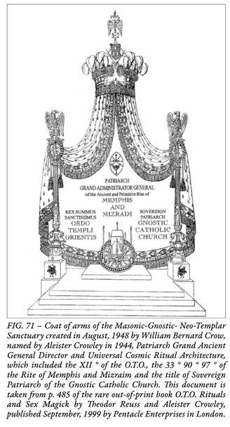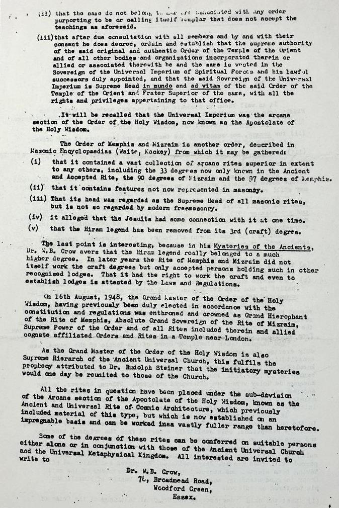 On 16 August 1948, Dr Crow was enthroned as head of the (Masonic-originated[v]) Rite of Memphis and Misraim and of the Ordo Templi Orientis (Order of Oriental Templars)[vi].