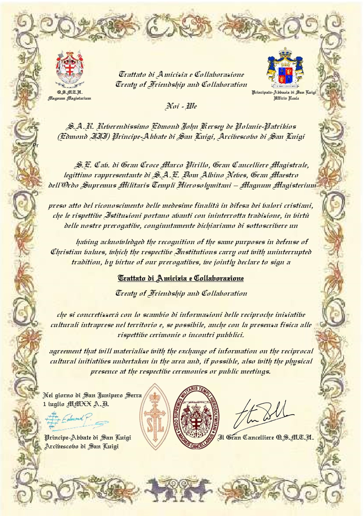 The Abbey-Principality of San Luigi has entered into a Treaty of Friendship and Collaboration with the Ordo Supremus Militaris Templi Hierosolymitani (O.S.M.T.H.)