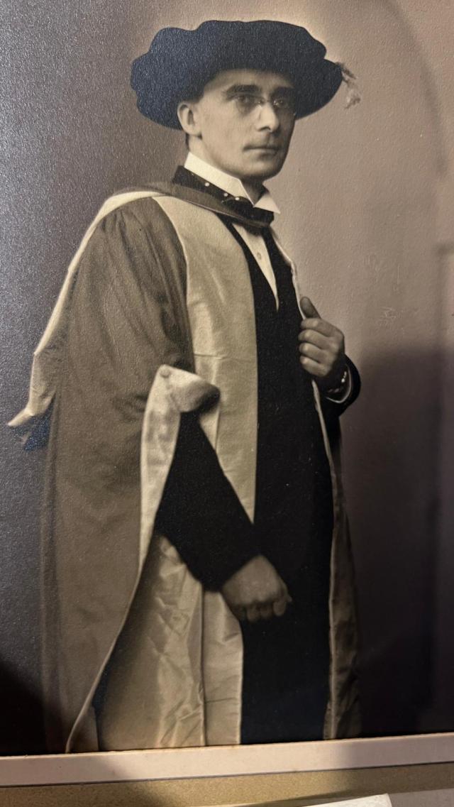 The academic robes for the Doctor of Science degree worn by Dr Crow in the photograph were of scarlet cloth, faced and the sleeves and hood lined with faculty silk, which for Science was gold.