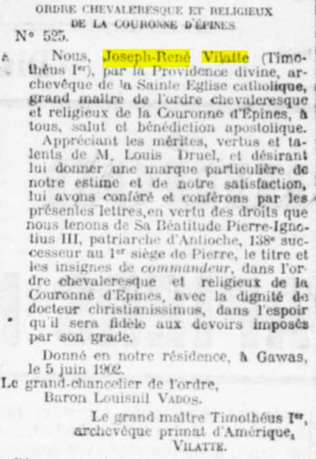 In 1902, Prince-Abbot Joseph III (Archbishop Joseph-René Vilatte) appointed Louis Druel to the rank of Commandeur in the Order of the Crown of Thorns. Druel was President of the Grand Prix Humanitaire de France et des Colonies, which would be subsequently absorbed into the Order as its Cross of Merit. The press notice of the appointment is reproduced below.