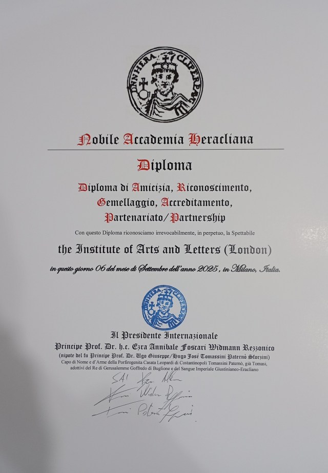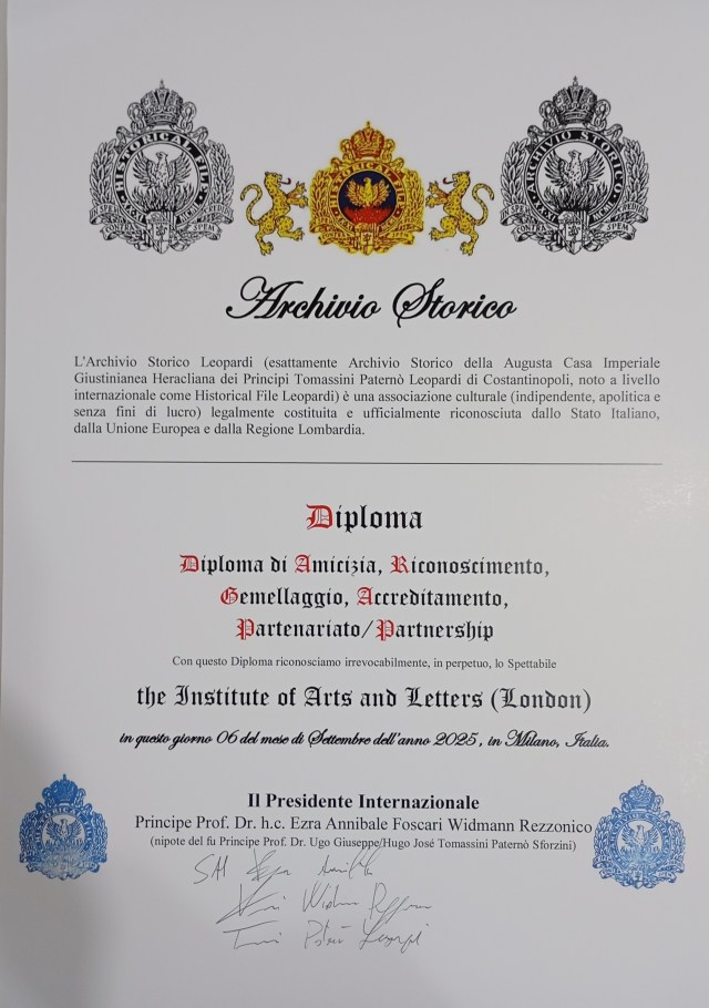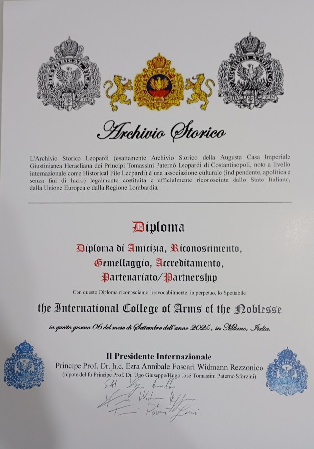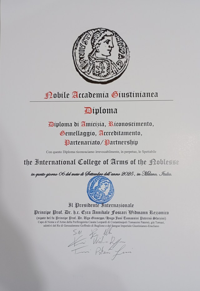 The Abbey-Principality has enjoyed a long association with the Imperial House of Tommassini-Paterno Leopardi of Constantinople, which is currently based in exile in Milan, Italy. Several institutions of the Imperial House have entered into a mutual full agreement of friendship, recognition, twinning, accreditation and partnership with the University’s dependent institutions The International College of Arms of the Noblesse and The Institute of Arts and Letters (London).
