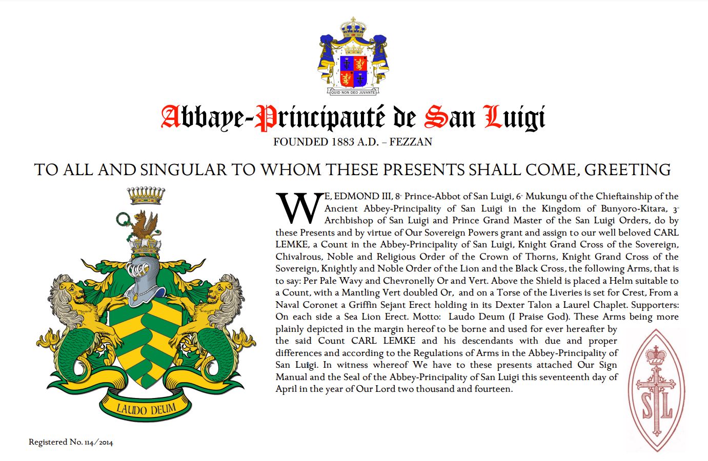 The Abbey-Principality extends its sincere condolences upon the death of Count Carl Lemke of Texas, USA. Count Lemke was born at Little Rock, Arkansas, on 24 October 1951. He was a Knight Grand Cross of the Order of the Crown of Thorns and the Order of the Lion and the Black Cross, and further held office in the Royal Byelorussian Orders. In 2014, the Prince-Abbot of San Luigi conferred on him the hereditary title of Count and granted him arms. He was also a Fellow of the Institute of Arts and Letters (London) and received the Grand Prix Humanitaire de France et des Colonies.