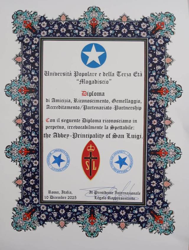 The University has issued a Diploma of Friendship, Recognition, Twinning, Accreditation and Partnership to the Abbey-Principality of San Luigi, in perpetuity.
