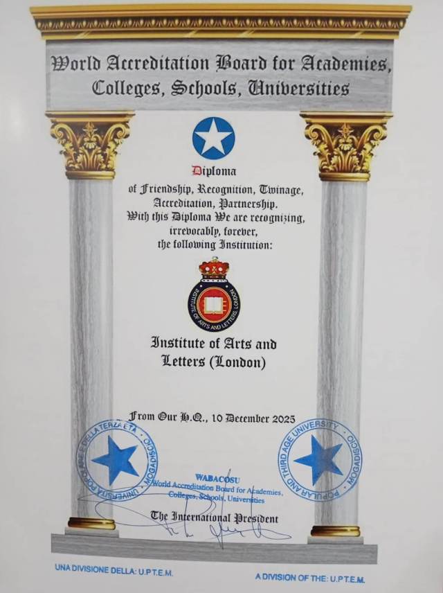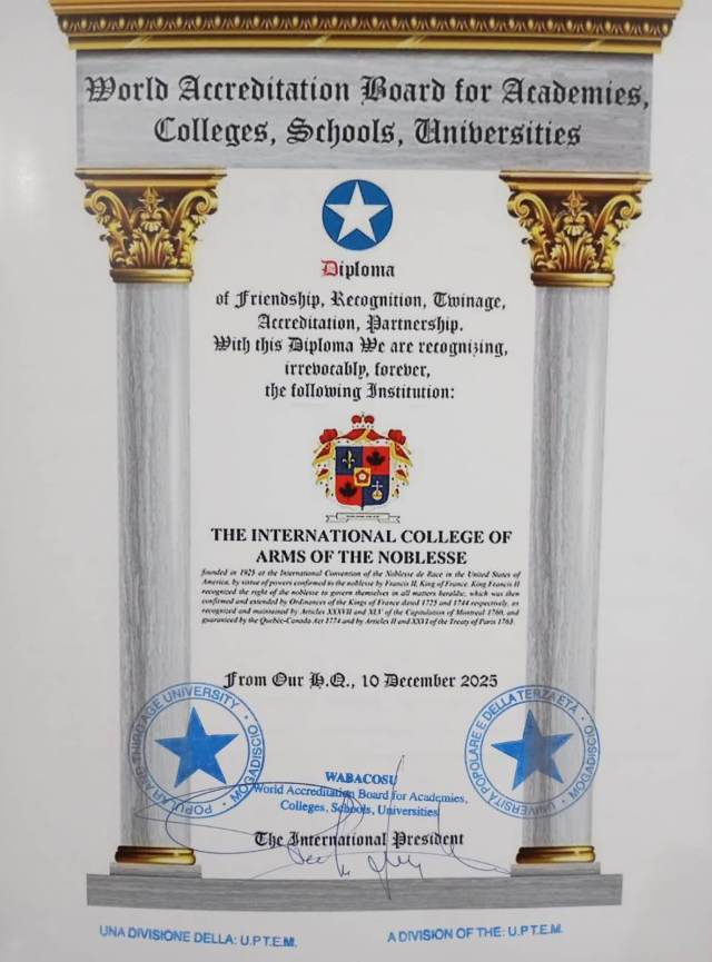 Several institutions of the Abbey-Principality have recently received accreditation from the World Accreditation Board for Academies, Colleges, Schools, Universities (WABACOSU), Rome, Italy. WABACOSU is a division of the Università Popolare e della Terza Età “Mogadiscio” established to further high and humane standards in the provision of education, particularly for adults. The institutions of the Abbey-Principality have entered into a mutual full agreement of friendship, recognition, twinning, accreditation and partnership with WABACOSU.