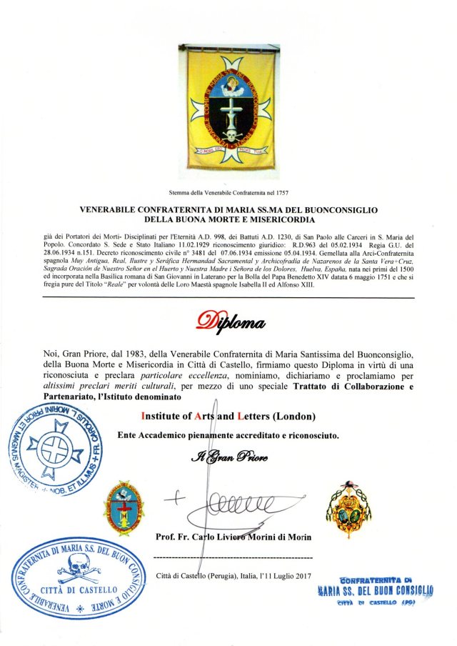 The Institute of Arts and Letters (London) has entered into a Treaty of Full Collaboration, Partnership, Accreditation and Recognition with the Venerabile Confraternita (o Compagnia) detta del Buonconsiglio di Città di Castello and the OR.VEN. – Ordine Venerabile della Venerabile Confraternita di Maria Ss.ma del Buonconsiglio della Buona Morte e