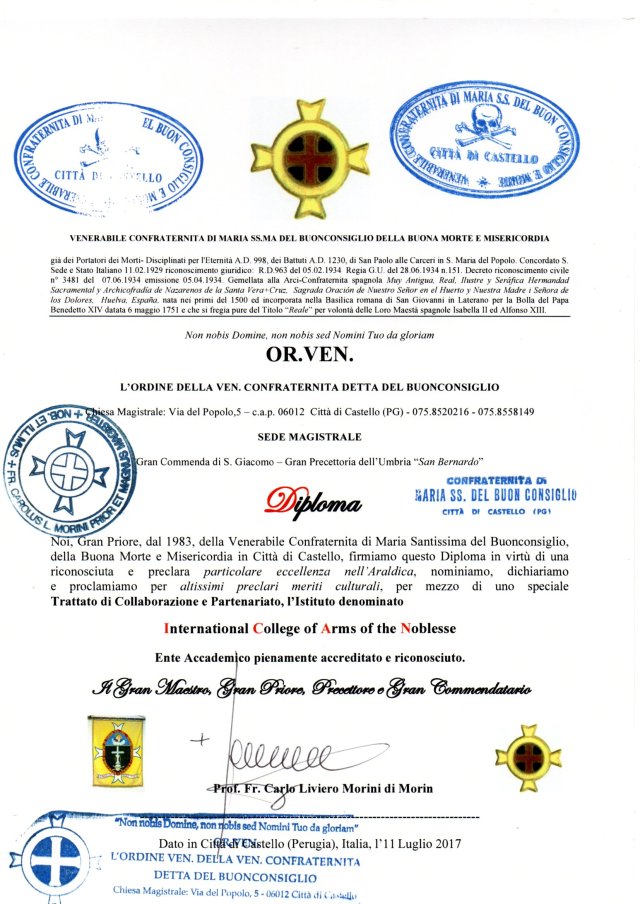 The International College of Arms of the Noblesse has entered into a Treaty of Full Collaboration, Partnership, Accreditation and Recognition with the Venerabile Confraternita (o Compagnia) detta del Buonconsiglio di Città di Castello and the OR.VEN. – Ordine Venerabile della Venerabile Confraternita di Maria Ss.ma del Buonconsiglio della Buona Morte e