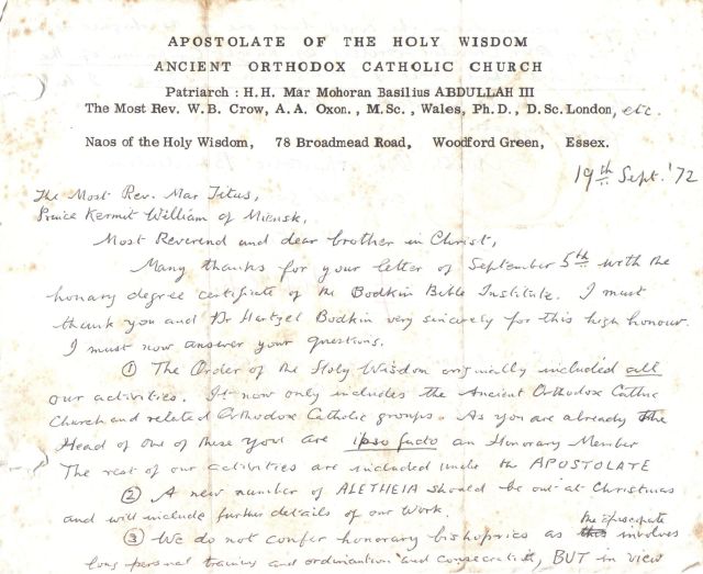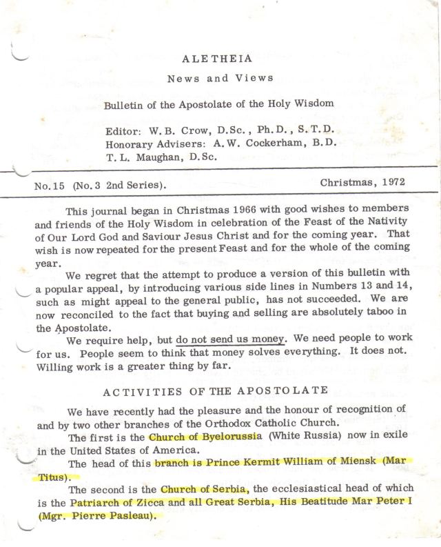 The Christmas 1972 edition of the official bulletin of the Apostolate of the Holy Wisdom, “Aletheia”, records the mutual recognition between Dr Crow and Prince Kermit and their respective jurisdictions: