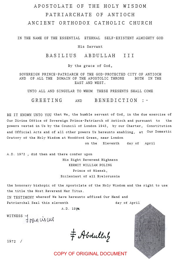 The position of honorary bishop in the Apostolate of the Holy Wisdom was a means of appointing to that organization those who were already substantive bishops in other churches, and establishing intercommunion with their jurisdictions while respecting their canonical boundaries. Pace Dr Bertil Persson, there is no evidence to hand that suggests that Dr Crow, who maintained an Orthodox theology of Holy Orders, ever purported to “consecrate” men to the episcopate merely by means of a postal ceremony[lxviii]. In the case of honorary bishops in the Order (later Apostolate) of the Holy Wisdom, such as Pierre Pasleau and John Trollnas, these men had already received valid Apostolic consecration before their appointments, and served in other communions. Indeed, in a letter to Prince Kermit that will be reproduced below, Dr Crow states very clearly “We do not confer honorary bishoprics as the episcopate involves long personal training and ordination and consecration…”[lxix] It is perfectly clear from Dr Crow’s address to Prince Kermit in the document at fig. 1 that Dr Crow recognized Prince Kermit’s existing Orthodox episcopal status, which derived from his consecration by H.B. Peter Andrew Zhurawetsky, Patriarch of the Byelorussian Patriarchate of St Andrew the First Called Apostle and of the Holy Orthodox Catholic Patriarchate of America.