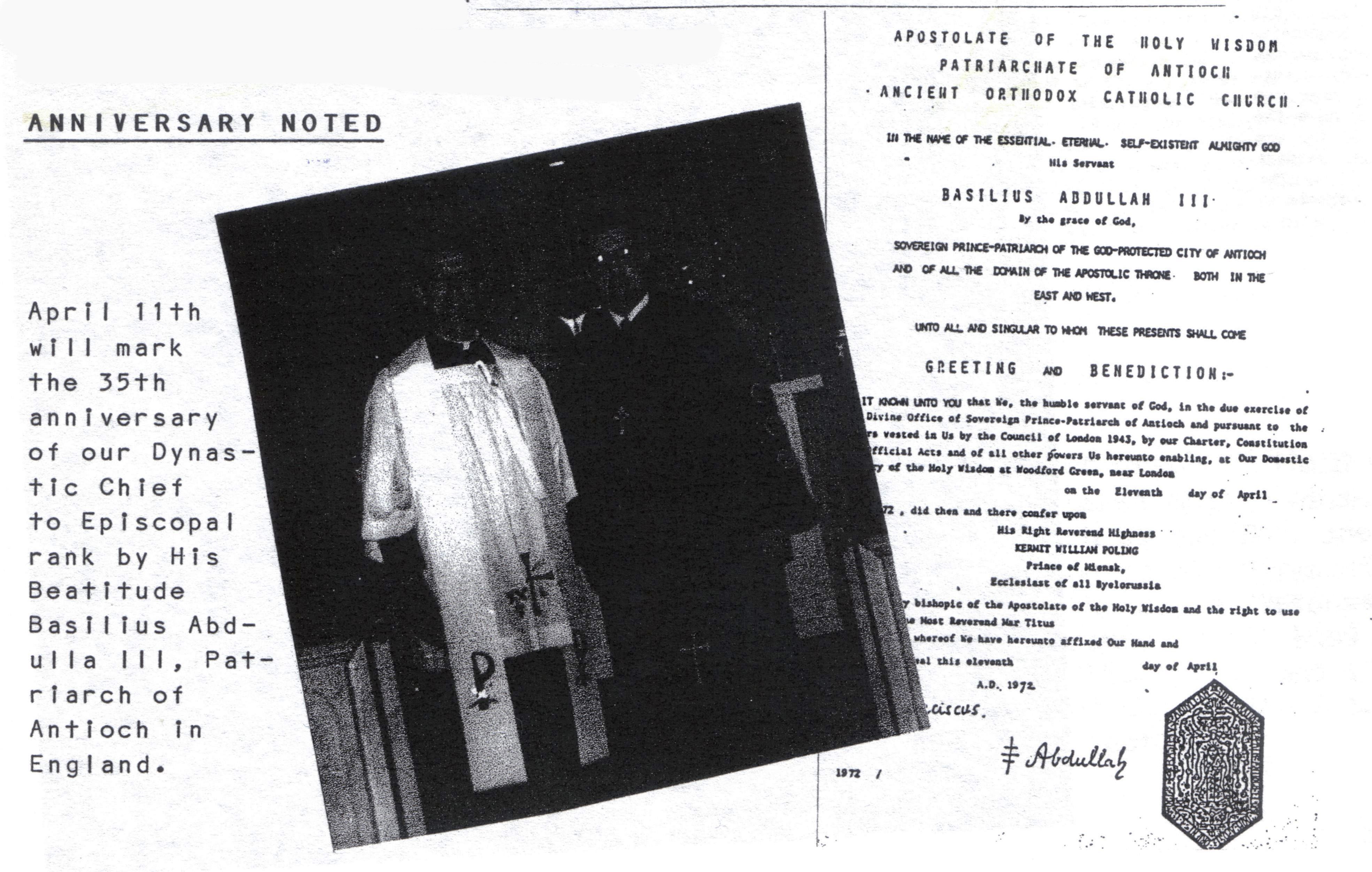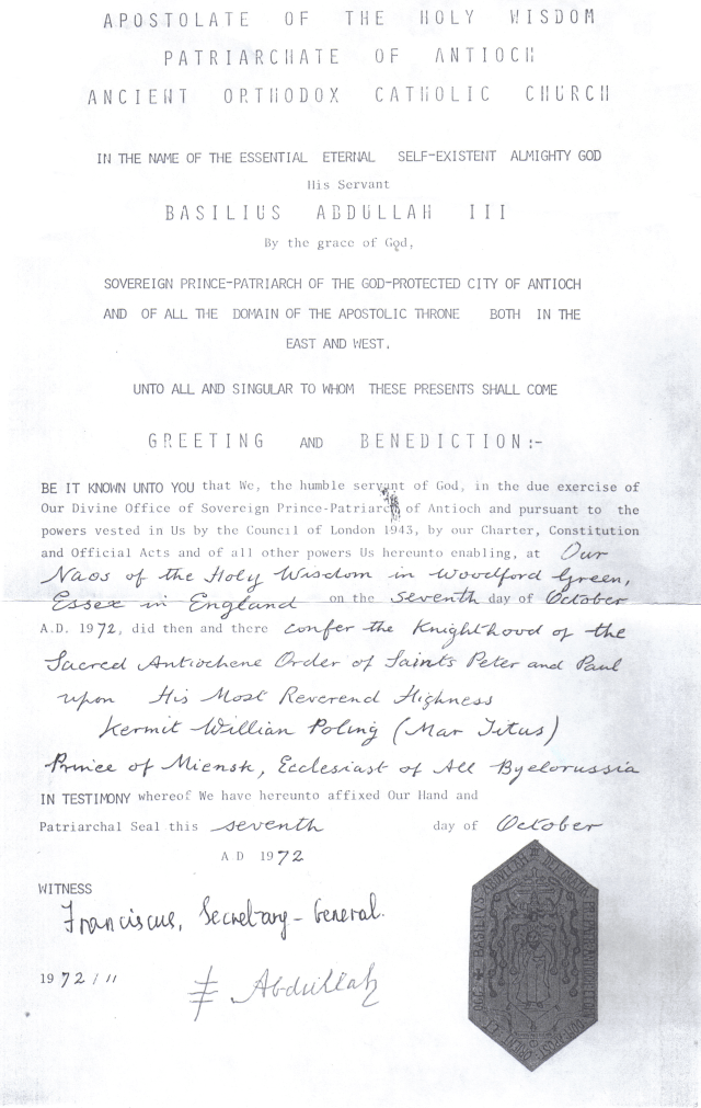 Nor have the institutions to which Dr Crow appointed Prince Kermit been idle. The Ancient Orthodox Catholic Church continued under his aegis as a private dynastic communion based in West Virginia, USA, merging with the Christian Orthodox Church (a dynastic ekklesia of the Byelorussian nobility), while the Order of the Holy Wisdom maintained a Grand Circle in America, perpetuating the degrees of the Order and admitting new members. Some of the documentation concerning these activities is reproduced below:
