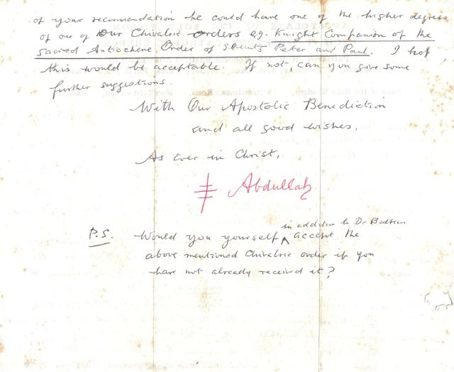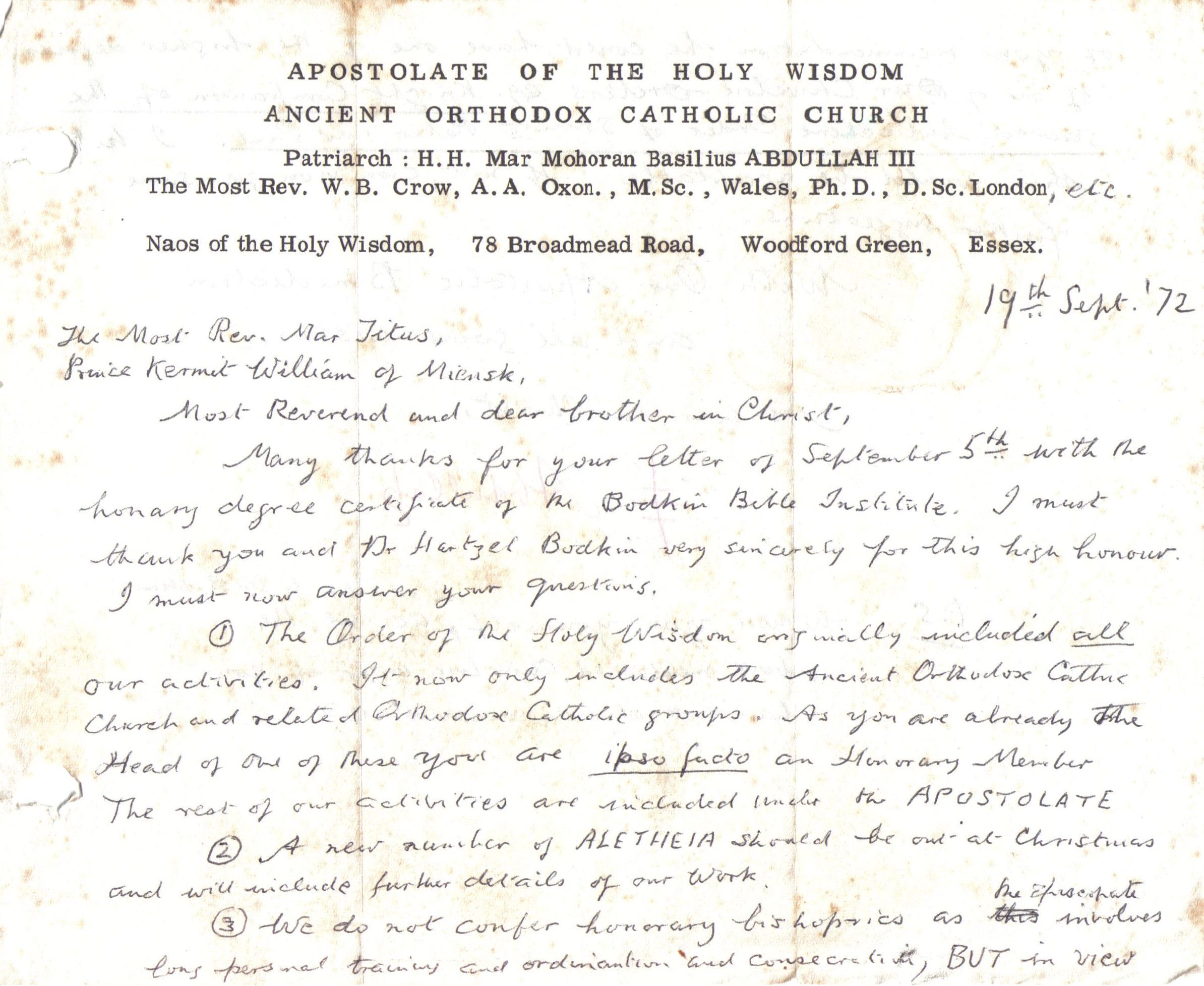 This letter, which addresses Prince Kermit by the designation Mar Titus that had been bestowed on him by Dr Crow, makes clear that Prince Kermit was also an Honorary Member of the Order of the Holy Wisdom. Having been offered membership in the Sacred Antiochene Order of Saints Peter and Paul, Prince Kermit accepted and was then admitted on 7 October 1972.