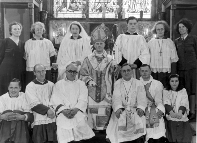 Mar Georgius of the Apostolic Episcopal Church and Catholicate of the West with members of the Catholicate of the West at the Abbey of Christ the King, Barnet, c. 1949. The priests in the front row are (L to R) Fr. Michael Waller, Fr. John Thorpe, Fr. Stephen Ball and Fr. Alastair Brodie [Photographic credit: Bishop John Cuffe/Orthodox Catholic Church]