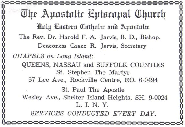 In 1927, by which time he had resigned from the Episcopal Church, Archbishop Brooks became pastor of Christ’s Church-by-the-Sea in Broad Channel, Queens, New York. Archbishop Brooks re-organized and re-incorporated the parish. Then in 1930 he joined with a second parish, the Lord’s Evangelical Church of Ridgewood Plateau, New York, and in a Synod meeting completed the organization of the Apostolic Episcopal Church, which was shortly afterwards officially recognized by the law of the State of New York. In 1934 Archbishop Brooks consecrated his first two chorepiscopi (suffragan bishops), Charles W. Keller and Harold F.A. Jarvis. Significant contacts and co-operation were established with major Orthodox jurisdictions, notably the Greek Orthodox Church and the Armenian Patriarchate of Jerusalem, which authorized Archbishop Brooks to ordain several priests for its American mission, as well as with Episcopalians and Protestant leaders who became part of a mission increasingly dedicated to ecumenical unity.