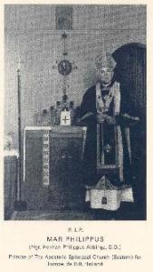 Originally a priest of the Liberal Catholic Church, Mar Philippus’s theology tended towards a Theosophical interpretation and was very different from the more conventional Orthodoxy of Mar Nikolaus. Since 1946, Mar Philippus had used the designation Oosters Apostolisch Episcopale Kerk (OAEK) (Eastern Apostolic Episcopal Church) for his mission, and after his release from the Catholicate of the West he constituted this church as an independent body and appointed himself as Primate. During that year, he was visited by Mar Paulos (Wadle). In August 1952 the OAEK entered into full communion with the Evangelical Catholic Communion under Bishop William Eaton Jeffery (Mar Iohannes), a former bishop of the Catholicate of the West, and also with the Oratorian Brotherhood under Fr. George F. Tull OB, then a priest of the ECC.