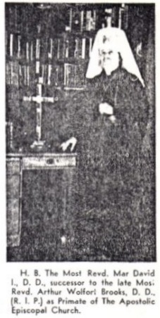 When Mar John Emmanuel died prematurely of hepatitis at the age of 59 on 7 July 1948, Mar David succeeded him in the united primacy of the Ancient Christian Fellowship and the Apostolic Episcopal Church under the terms of the 1947 Concordat, becoming additionally AEC Presiding Bishop and Ecclesiastical Administrator. Mar Carolus (Charles W. Keller) succeeded Mar John Emmanuel as Rector of Christ’s-Church-by-the-Sea. In 1947, the AEC had reported a total of 7,086 members.