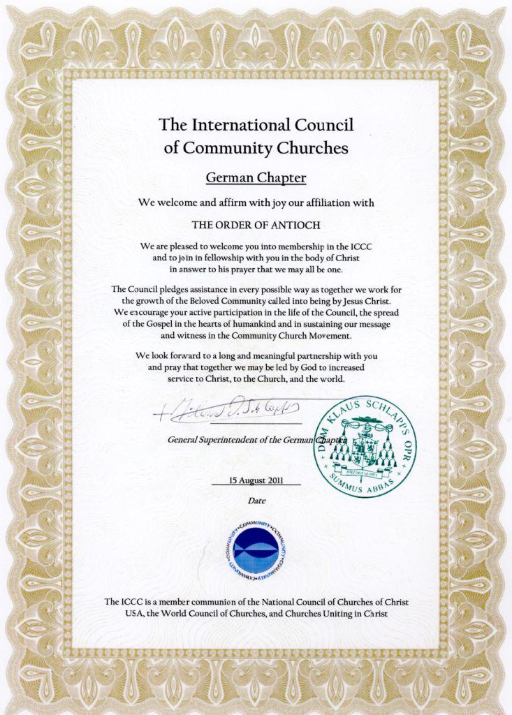 The Order of Antioch is a member communion of the German Chapter of the International Council of Community Churches (ICCC). The ICCC is a member of the World Council of Churches, Churches Uniting in Christ and the National Council of Churches USA. The former General Superintendent of the German Chapter of the ICCC, the late Dom Klaus Schlapps OPR, was a member of clergy of the Order.
