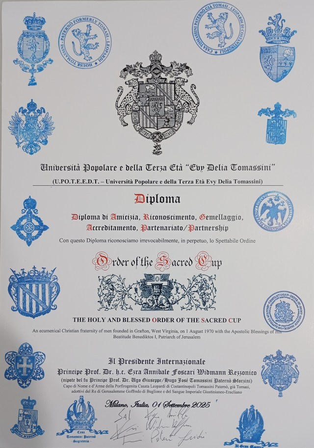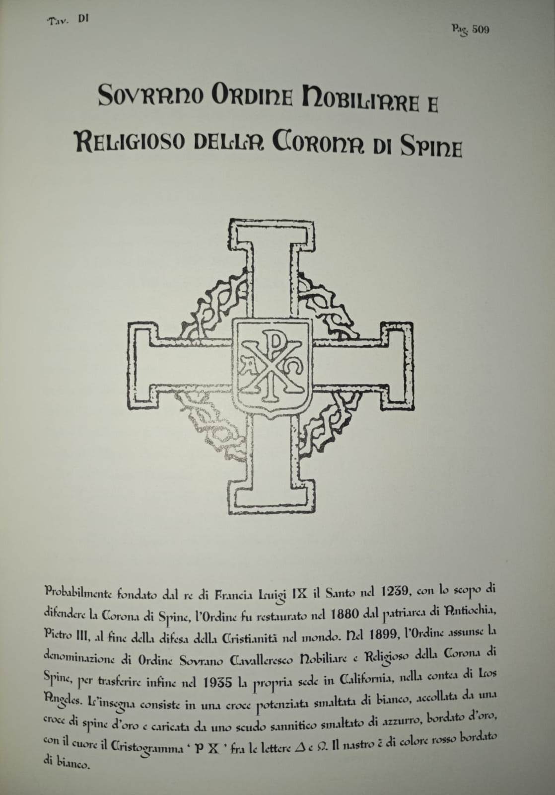 The Order of the Crown of Thorns is listed in the reference work “Repertorio Iconografico degli Ordini Cavellereschi” by Don Francesco Alfredo Maria prof. Mariano duca d’Otranto, published by the Consiglio Araldico Italiano – Istituto Marchese Vittorio Spreti in 2003. This institution was founded in Turin in 1948.