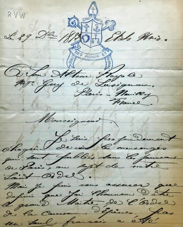 The Abbey-Principality has recently been sent a copy of an important letter of Mgr. Joseph-René Vilatte (1854-1929) (who would become Prince-Abbot Joseph III of San Luigi in 1899). The letter is dated 29 December 1893 and is addressed to Prince Guy de Lusignan (1831-1906), a Patron of the Order of the Crown of Thorns.