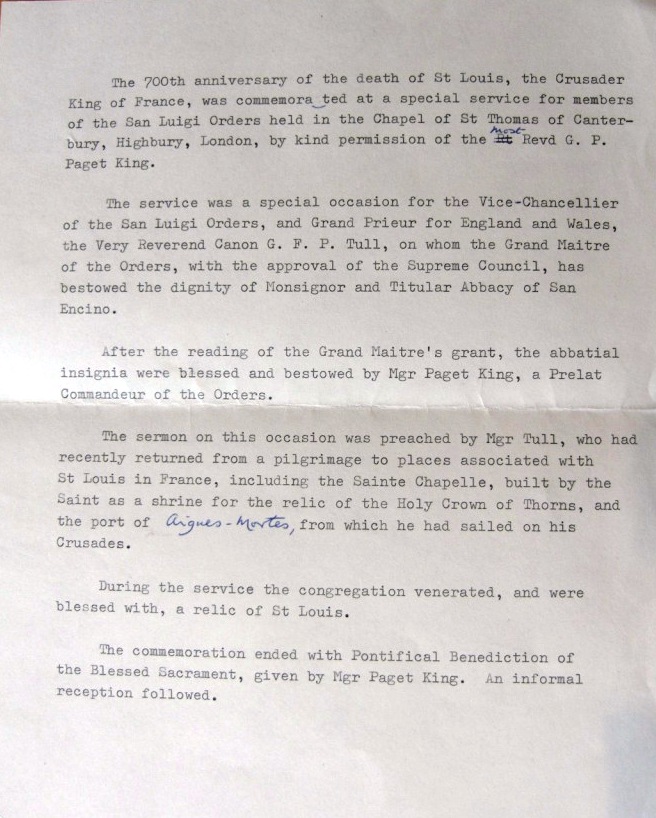 >>700th Anniversary of the death of St Louis commemorated by the English Grand Priory, August 1970 – and an invitation to this event