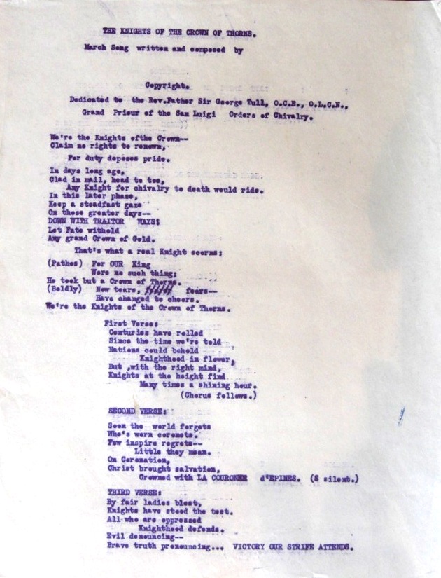 >>Text for the March Song “The Knights of the Crown of Thorns” by Chev. Frederick Bowman, 1961 (This has since been adopted as the Anthem of the Abbey-Principality)