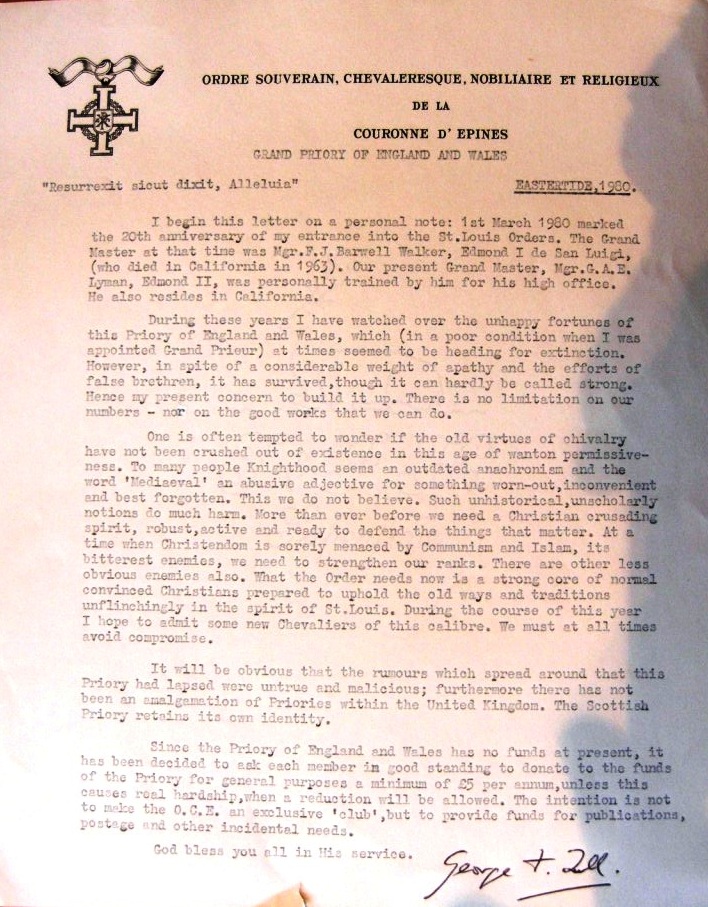 >>Letter of Mgr. Tull to members of the Grand Priory of England and Wales, 1980