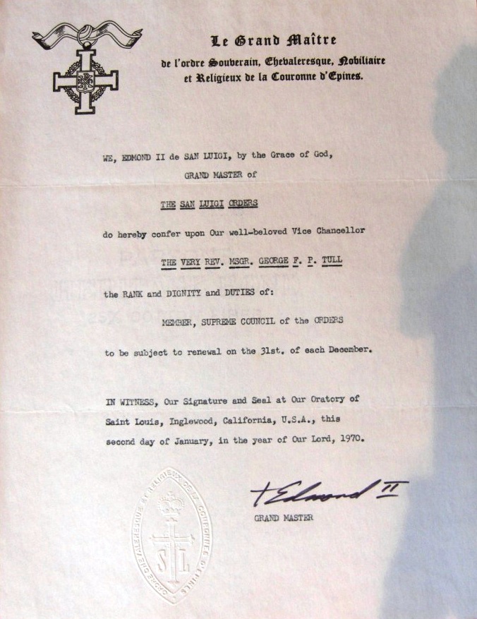 >>Brevet of Edmond II creating Mgr. Tull a Monsignor and Mitred Abbot in the OCT, June 1970