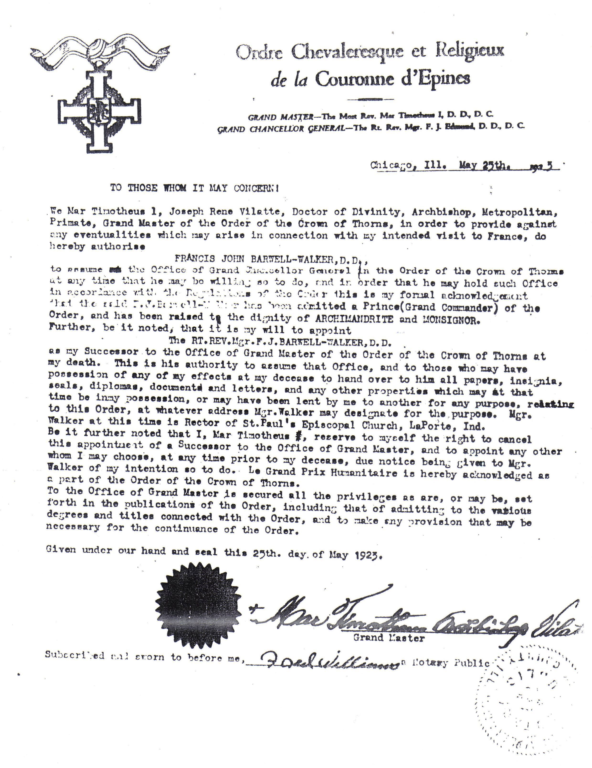 >>25 March 1923 Notarized statement of Prince-Abbot Joseph III naming Francis John Barwell-Walker as his successor in the Order of the Crown of Thorns and related entities.