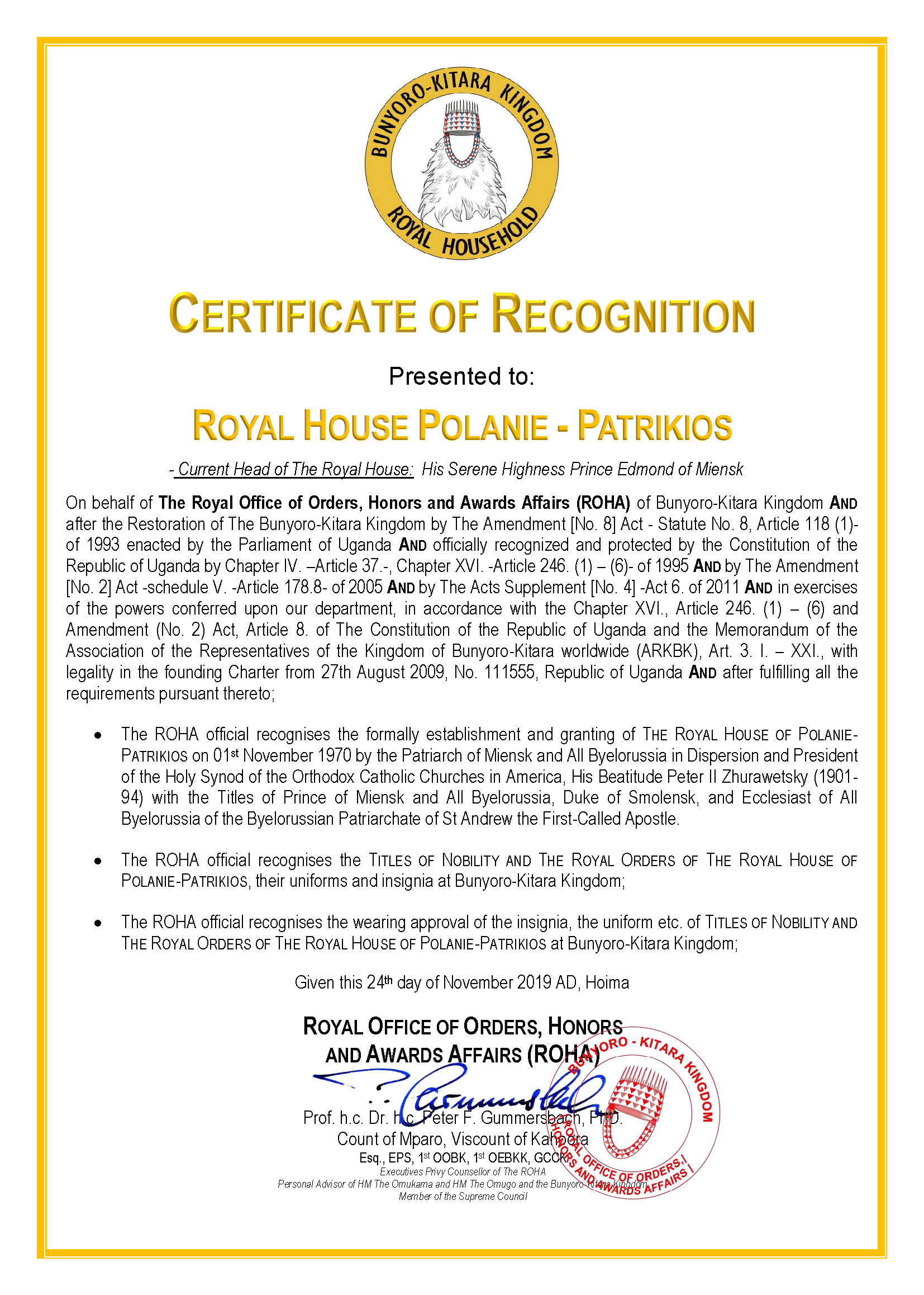 The Royal House Polanie-Patrikios was recognized early on by Marziano II: